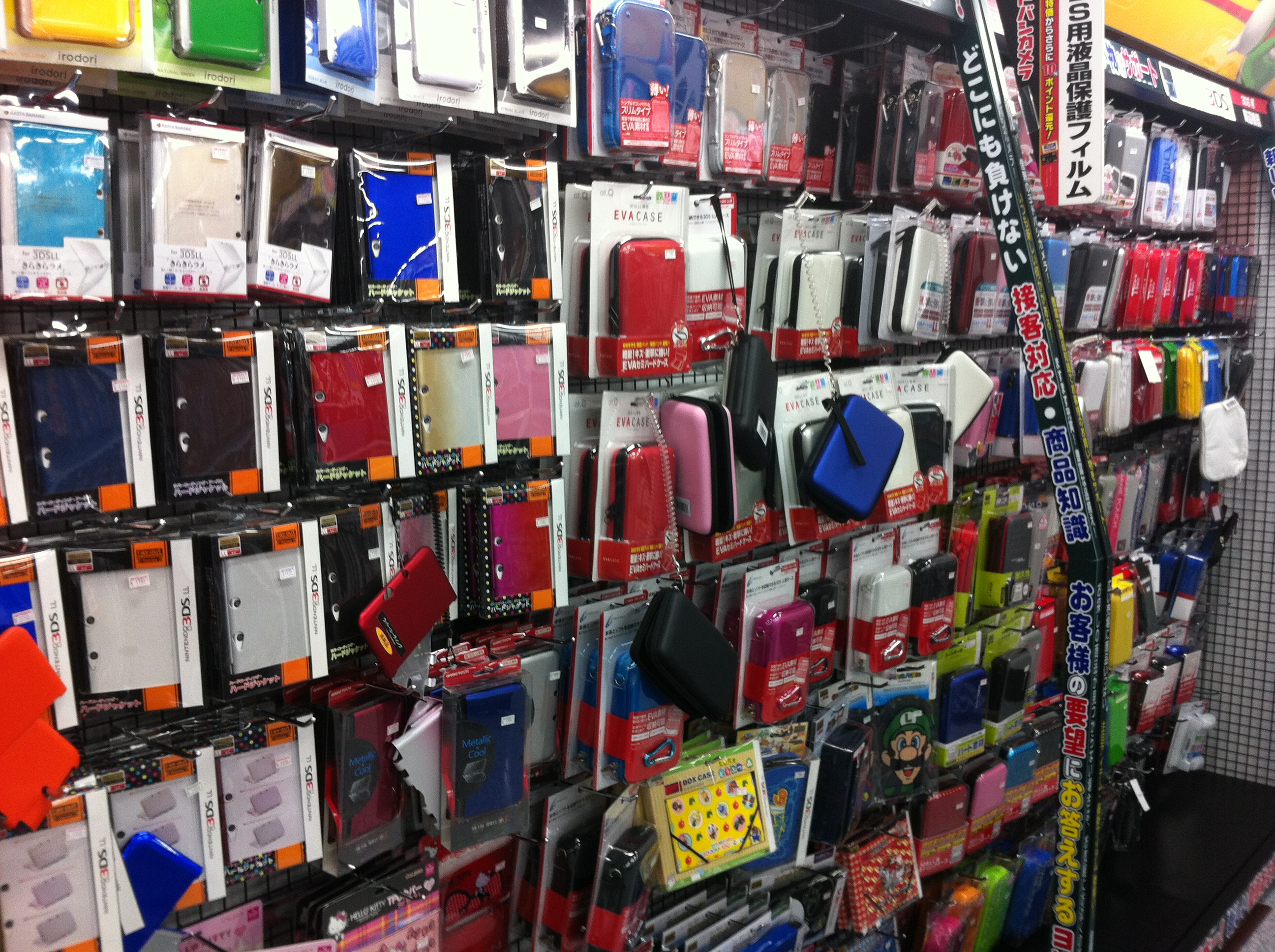 I’ll bet these cover plates will be an enormous money spinner for Nintendo, especially in Japan. When I was over there in 2013, I was astonished at how many accessories were on sale for the 3DS (see photo below, taken in the shop Kyoto Yodabashi). The accessories section was almost as big as the game section, and it was filled with every possible kind of case, stylus and cover. This fits in with the trend for accessorising mobile phones – no Japanese teenager would be seen dead without multiple straps and/or stickers covering their keitei.