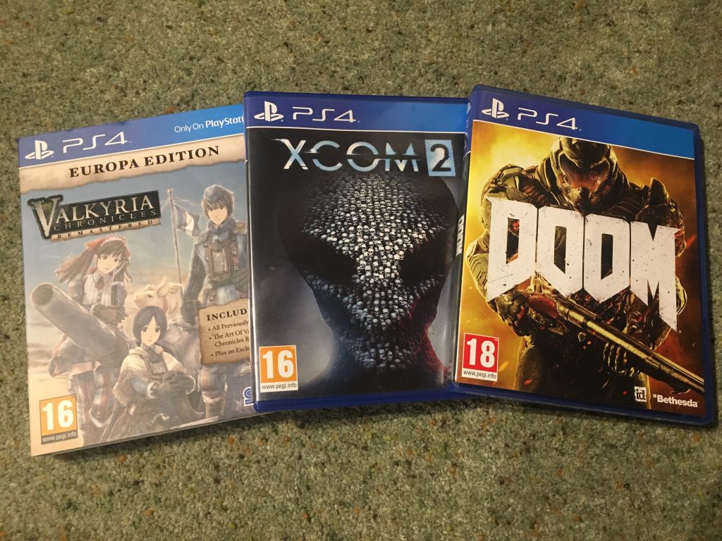 Here are my most current titles – the rest of the box mostly contains games from several years ago, waiting patiently for their turn to be played. But XCOM 2 and DOOM were only released in 2016, making them practically cutting edge in terms of my game collection. (I’ve already traded-in Valkyria Chronicles Remastered since this photo was taken – it’s now been replaced by Tomb Raider on PS4.) Valkyria has quickly become one of my all-time favourite games (review coming soon), but now I’ve finished it, I know I’ll never go back to it again.