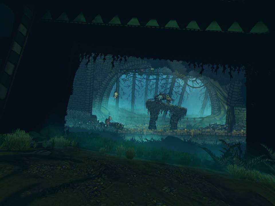The story of The Lost Bear is simple. You are a child that has lost your beloved stuffed bear, due to some strange little creature making off with it, and so you must journey through the creepy woods nearby to find it. Naturally, you can’t simply walk in there and pick up the bear. Treacherous terrain and strange, angry creatures will do their best to halt your progress. You’ll have to get past them using some pretty basic adventure-platformer (that’s what I’m going to call these Out of This World type games from now on) mechanics that ordinarily wouldn’t be much to write home about, but some creative inclusion of various motion controls makes things interesting. You’ll have to use your controller to do things like aiming your slingshot, manually turning cranks, and more.