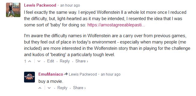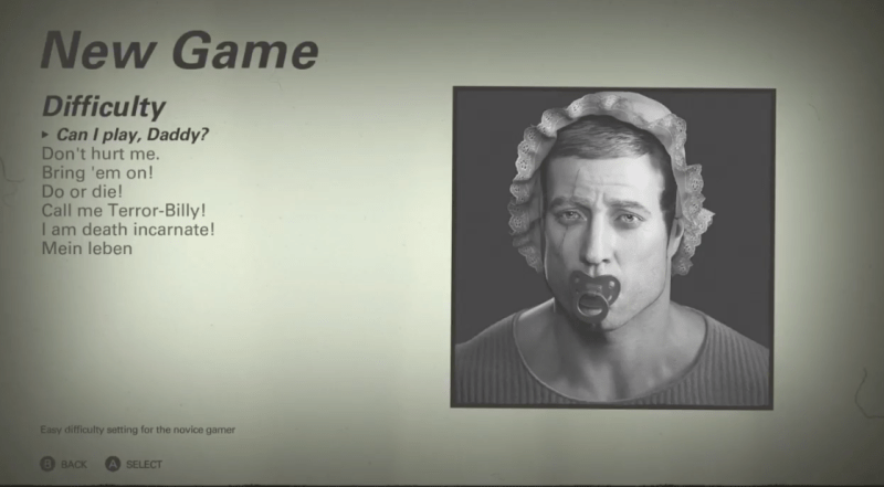 I felt it myself earlier today, when I left a comment agreeing with Ethan Gach’s Kotaku article suggesting that we might need to rethink difficulty menus. My comment agreed with his point that Wolfenstein II is much more enjoyable when played on easy, but I resented the implication that I was some sort of “baby” for choosing a lower difficulty – a point that is very much emphasised by the options screen.