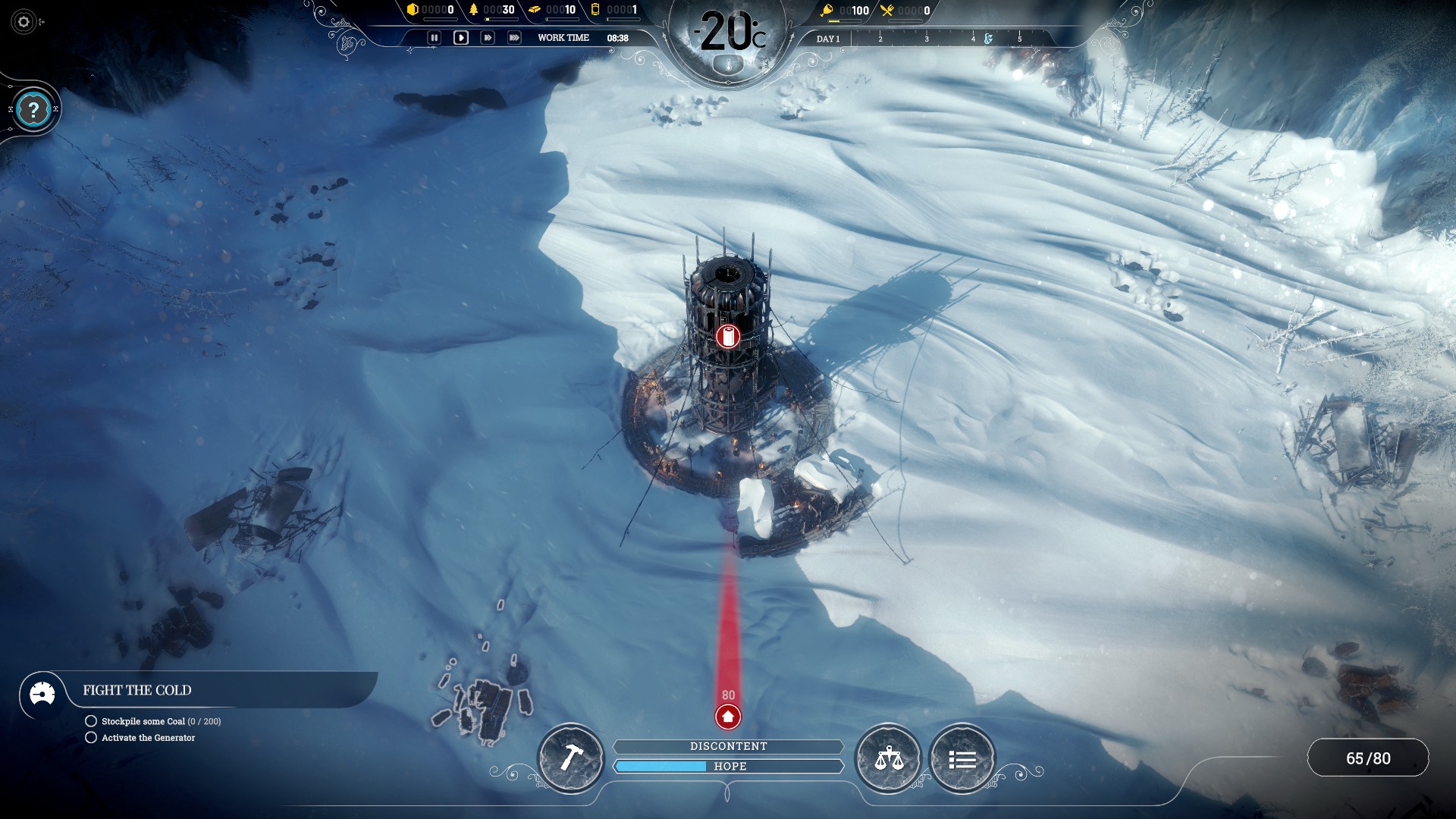 Any new citizens are immediately welcome for their ability to do a job, but not so welcome for their need of shelter, warmth, and yet more food. Keeping them all happy is key for generating Hope, a passive resource that, unsurprisingly, measures the feeling of the population. This indicator shows how likely they are to keep on going, or simply give up and walk into the snow to die. Yes, really.