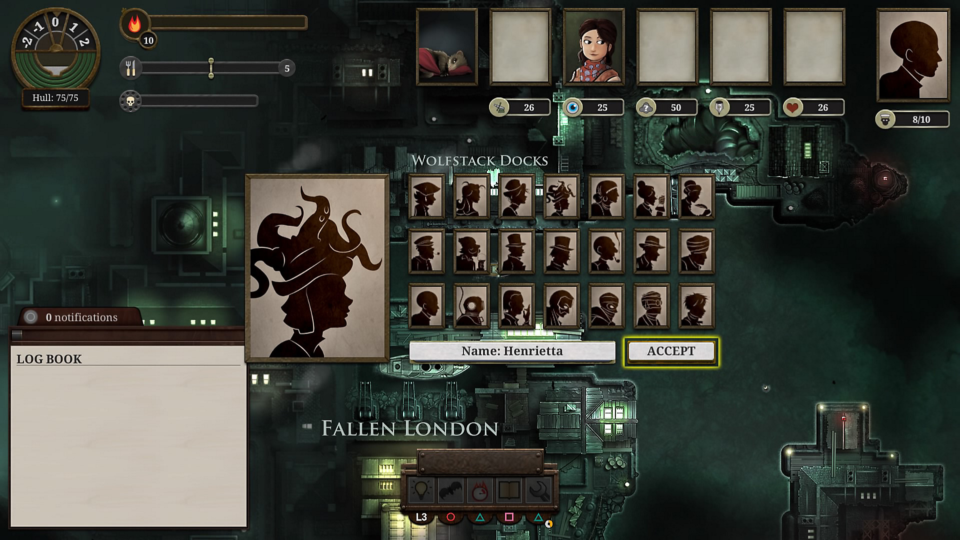 And if your captain dies, the penalties are harsh. That character is gone, and you start out in Fallen London again as another character of your choosing, possibly a rival captain or even your dead captain’s son or daughter. You only keep a portion of your experience and some of your goods, depending on whether you made a will and bought certain upgrades. And worst of all, the map is reset, with islands moving to different places, and the whole sea once again being covered in the fog of war.