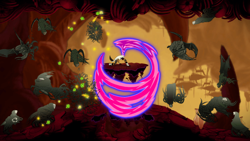 The game opens with protagonist Esche pushing against a hard desert wind, only to find herself transported to a weird ‘elsewhere’. From then on, she must make her way around an ever-shifting world in search of powerful shards, which she can either destroy to gain points for levelling up or ‘corrupt’ to gain extra abilities. This choice essentially amounts to following a ‘good’ or ‘evil’ path, respectively, leading to one of four endings. But if I’m being honest, the story bounced off me rather quickly, and I pushed forward because of the gameplay rather than the plot. I wanted the story to be mysterious in a way that intrigued me, but instead it was cryptic to the point of opacity.