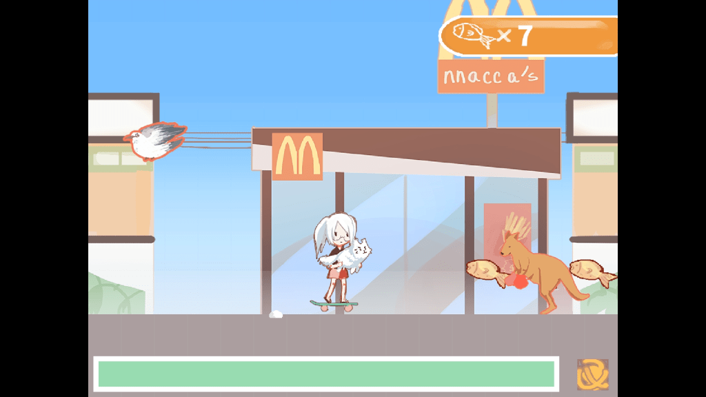 Kaidi, Armed with a Cat is remarkably endearing. It has obviously been made with a lot of love. Extra outfits can be earned, which give different abilities. There are also pictures to unlock, which apparently tell of the developer’s experiences as an international student. A few of the little touches, like the glint in the eye of the ibis birds as they throw garbage at you, add an extra something too. It’s not a game I’m going to put loads of time into, but I found it quite charming.
