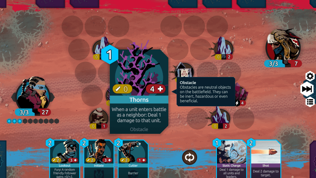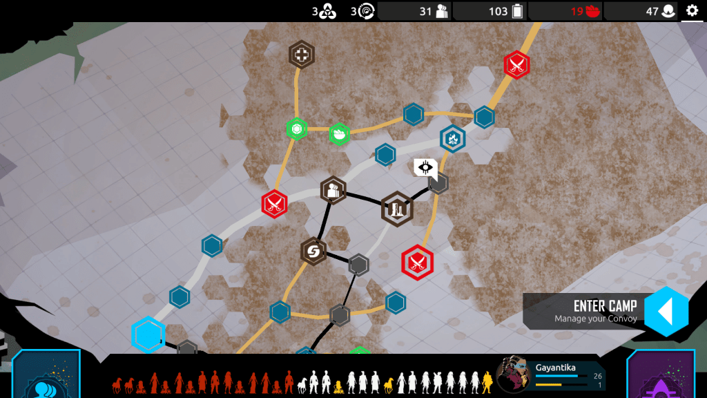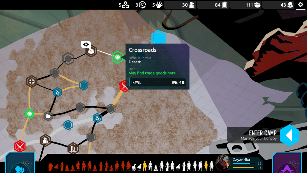 If all that sounds a bit complicated, that’s because it is – although in a good way. I barely scratched the surface of the strategies on offer in my short time with the game. There are huge possibilities here for refining your deck and tweaking your play style. But there’s also a big emphasis on pure survival. If one of your followers is knocked out in a battle, they become ‘wounded’, and can only be healed at one of the safe encampments scattered through the desert. You can still use them when they’re wounded, but if they’re defeated again, they die and are permanently removed from your deck. Combined with the scarcity of food in the desert and the constant danger of running out of supplies, it means Nowhere Prophet becomes a tense game where you’re always just about scraping by as you eke out an existence in the wasteland. Compelling stuff.