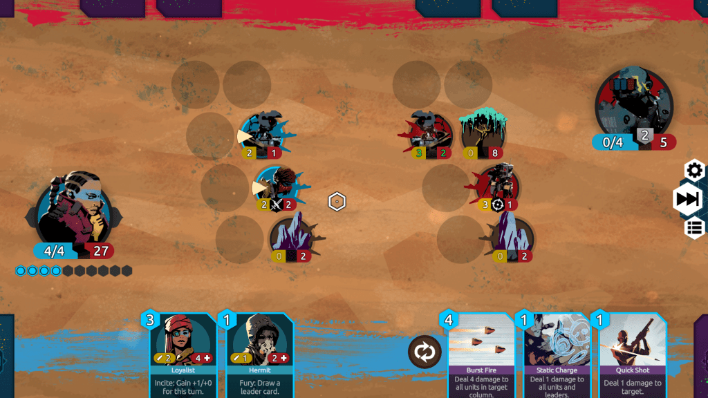 Then you have the battles themselves, in which the aim is to defeat the enemy leader. The basic gameplay sees you drawing followers from your convoy deck and then placing them on the battlefield, with the caveat that they can’t actually attack until the next turn. You can attack the enemy leader at any time, but you can only attack enemy followers if they are in the front line of circles. Likewise, your followers can only attack if they’re on the frontline.