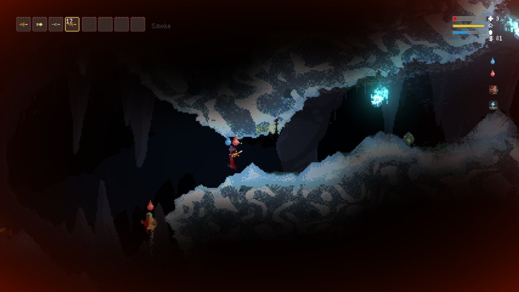 The idea of this rogue-like is that every single pixel is simulated, so you can end up in ludicrous domino situations where, for example, a shot from your wand can ignite some grass, which sets light to a cloud of flammable gas, which in turn sets light to enemies, who then run around setting other things alight. Basically, the world of Noita is extremely dangerous, and also hilarious.