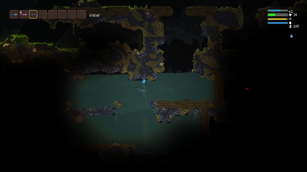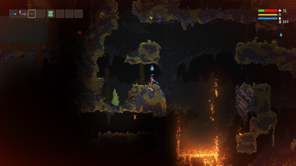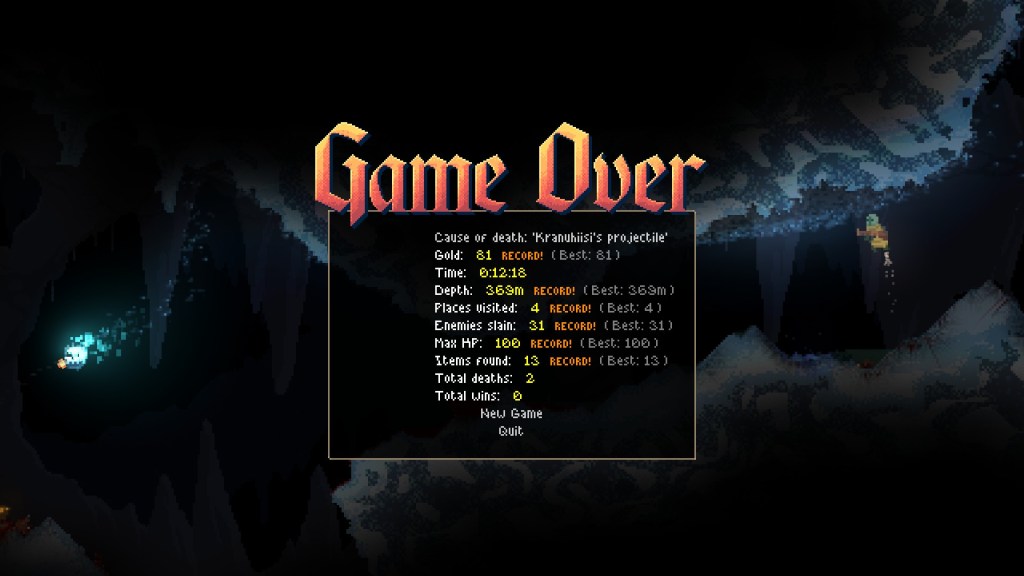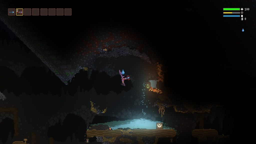 Above is a selection of screenshots from my first half hour with Noita. After a few self-maiming mishaps with my bomb-chucking wand, I opted to proceed cautiously, zapping enemies from a considerable distance whenever I could. But even then, it’s almost impossible to plan for the mayhem that can ensue – like when a baddie lobbed a bomb at me that I managed to dodge, but it caused a crack in the ceiling that dumped a lake’s worth of toxic sludge on my head.