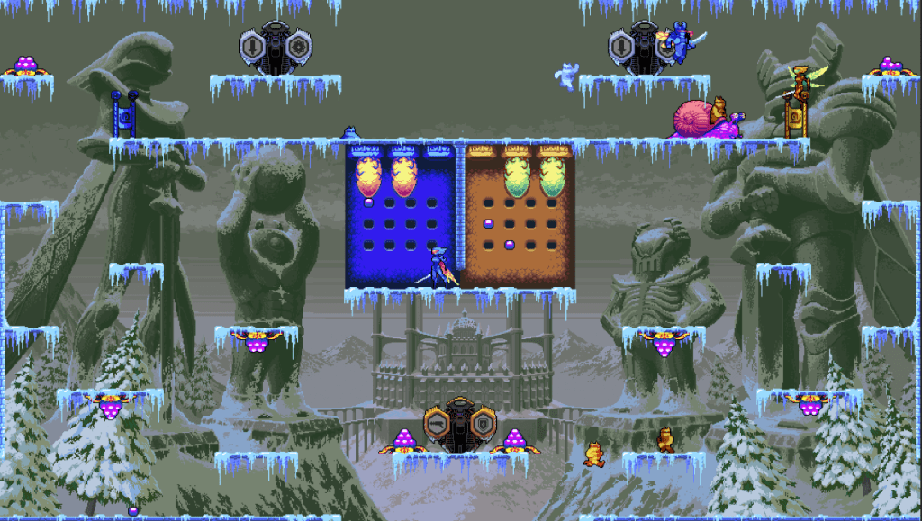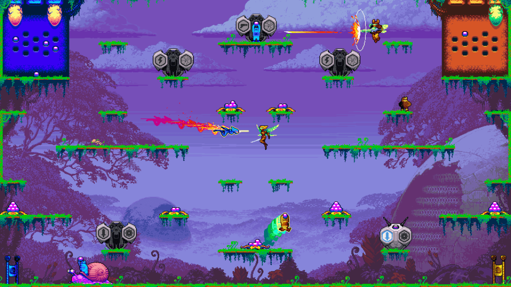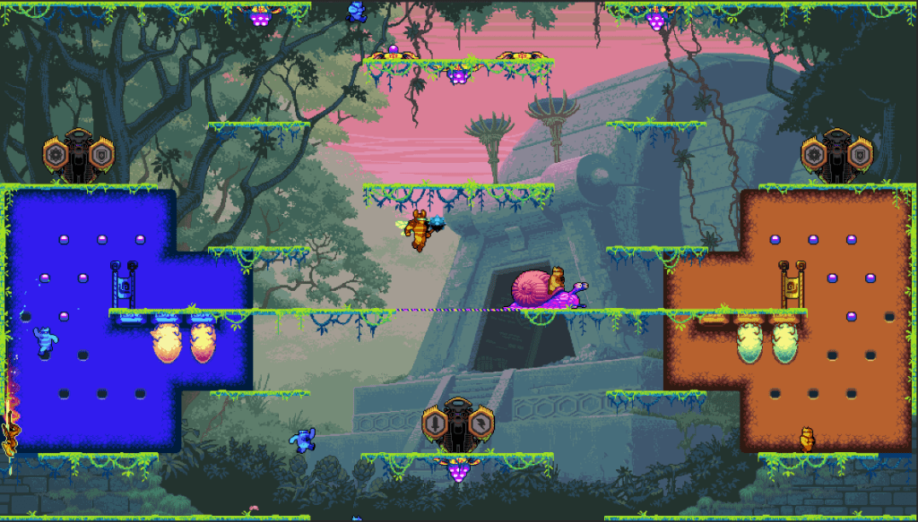 As queen, you have to protect your hive while your team mates try to move the snail or snag berries, but you also be defensively minded, because the opposition can score a point through your demise. As a worker, it’s your responsibility to either capture the snail and move it across the map, collect said berries or become a warrior and backup whoever needs help. After death you respawn, but time is of the essence, and having to wait even a few seconds can prove disastrous.