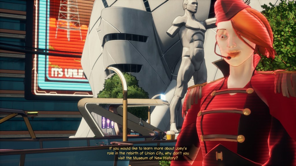 I was also a bit frustrated that I didn’t get to explore more of the city. There are around nine main locations, each of which you visit multiple times, but I would have liked to see more of the workings behind the facade, along with the luxury living of the elite at the very bottom. Some of my favourite parts of the game involved learning the city’s lore and the frosty relationship it has with other megacities in this tarnished version of Earth, but there’s mostly very basic information on this kind of stuff. I got the feeling that perhaps other locations to visit were planned but then scrapped – for example, there’s a lot of references to Spankles, the fortified soft drink that Union City’s residents live on, and even an advert about meeting the mascot Mr Spankles at 3pm, but none of this really goes anywhere. I suspect that originally the developers might have planned a visit to the Spankles manufacturing plant or something along those lines, but it got dropped somewhere along the way.