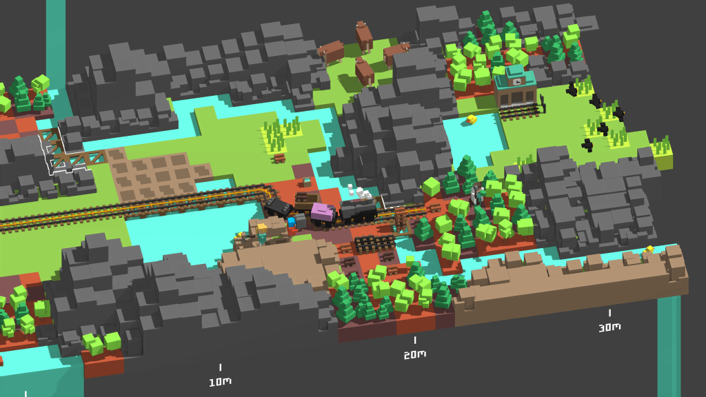 The game is played in top-down manner, with some very fetching voxel art. You’re tasked with simply getting a slow but always moving locomotive to the next station by harvesting materials from the environment to build new train tracks and other pathways. You can only carry one tool at a time, so the major challenge of Unrailed is managing your time in such a way that you can gather the resources you need while offsetting things like bridges, random enemies and the train potentially catching on fire. Get good at it and you can do things like upgrade your train and make risky maneuvers to speed things up.