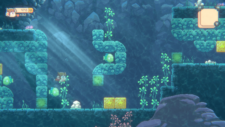 The game stars an affable little boy named, obviously, Alex Kidd, who must save the kingdom he lives in from a banal villain, and so on and so forth. Miracle World DX has a quirky and fun aesthetic that adds a ton of personality to an otherwise pedestrian but serviceable plot. Like most platformers, the point of the game isn’t to follow its sweeping storyline, it’s to test your skills at maneuvering within the world and bopping a few cutesy enemies along the way. Mr. Kidd doesn’t hop on his enemies as is commonplace in the genre; he primarily punches them with a cartoonish fist. Adjusting to his small melee hitbox takes some getting used to, but it becomes second nature eventually. Which is good, because the game can be punishingly tough, as young Kidd doesn’t have a life bar. You’ll see his angelic ghost rise to the top of the screen all too often.