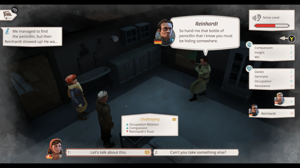 Being both a citizen of the United States and a health-care provider (when I’m not gallivanting as an amateur games writer), I found Gerda to be a compelling protagonist – and I am well aware of what it’s like to live in a divided country. When Gerda first pulls into the train station just in time for Christmas, she’s greeted by her husband, a gracious and deliberate Dane, and her father, who recently joined a party that, while they don’t necessarily follow all the ideologies of Nazism, do feel patriotic towards Germany. It’s an interesting confrontation right from the get-go, and one that I felt was easy to navigate because of historical hindsight, but also because Gerda’s father comes off as a vaudevillian idealist who can’t think beyond his small sphere.