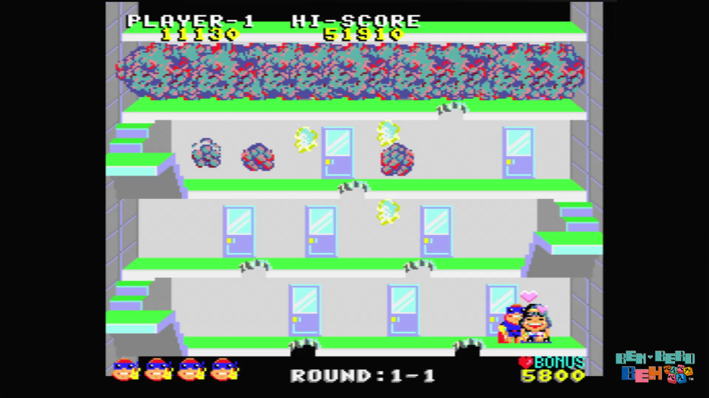 The game is a single-screen affair that moves stiffly as you dodge obstacles and put out fires with an extinguisher on your way to the rescue. It has its charms, but Ben Bero Beh is definitely one of the weaker offerings here.