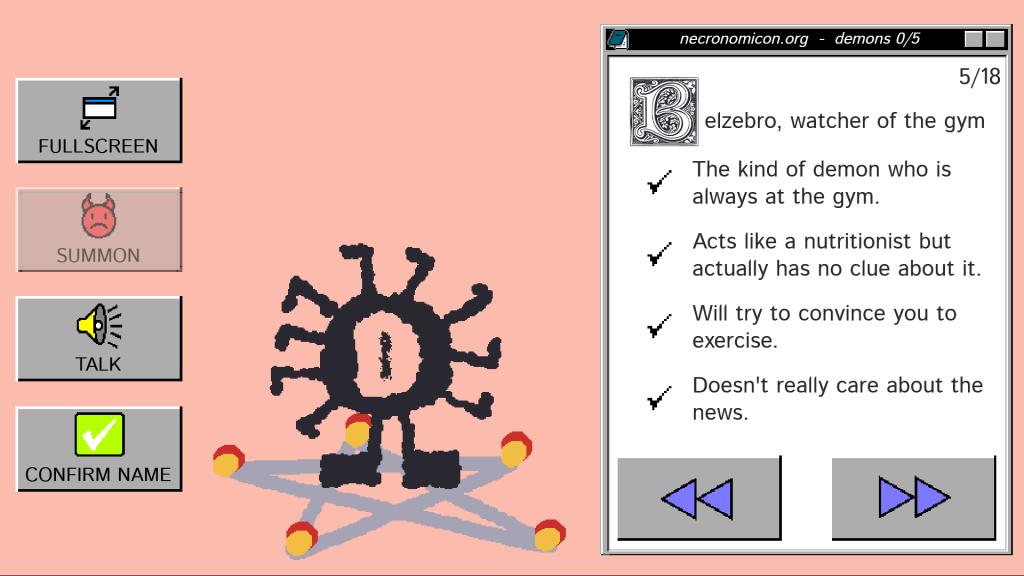 Yet another brilliant title in the Curios section, Demonology 101 by Ludipe was made as part of a game jam, and it sees you summoning demons and trying to guess their name so you can control them. There’s a list of facts for each demon which you have to match with what they say to you, but it’s made trickier by the fact that some demons always lie, while others only tell the truth, and some will impersonate others. It’s free to download on itch.io and only very short, but well worth a few minutes of your time.